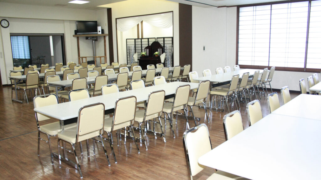 ホールは最大140名まで収容可能で、大規模な葬儀や社葬に対応しています。