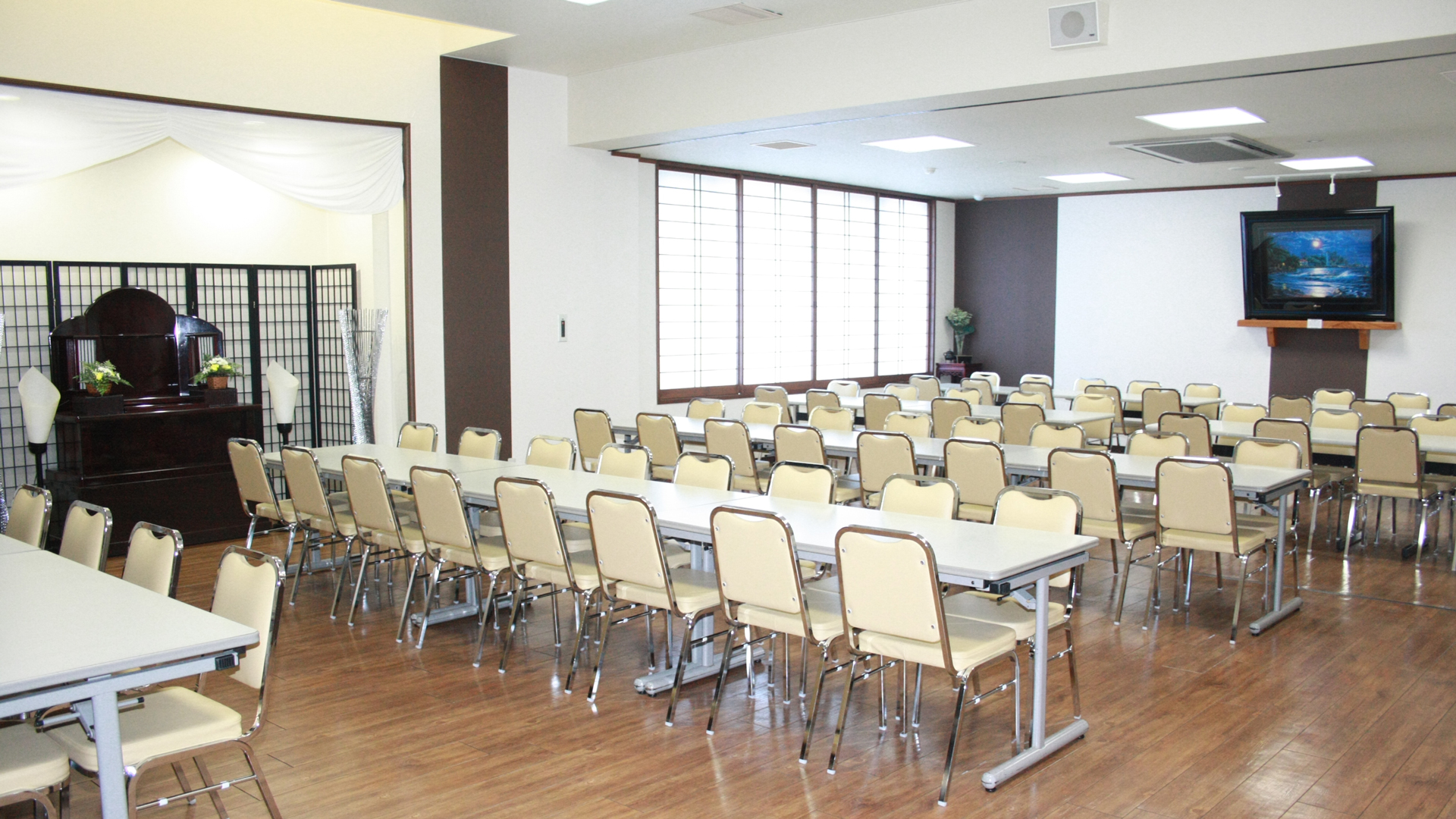 | ホール | 最大140名収容可能。大規模な葬儀や社葬に対応。最新の音響設備と映像設備を完備。 |