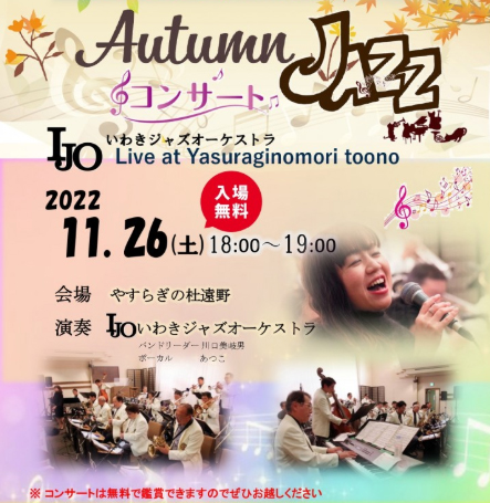 11月26日(土)やすらぎの杜遠野において午後6時よりいわきジャズオーケストラの演奏会を開催いたします。昨年の開催では多数の方にお越しいただき大盛況でした。この機会にぜひお越しください。