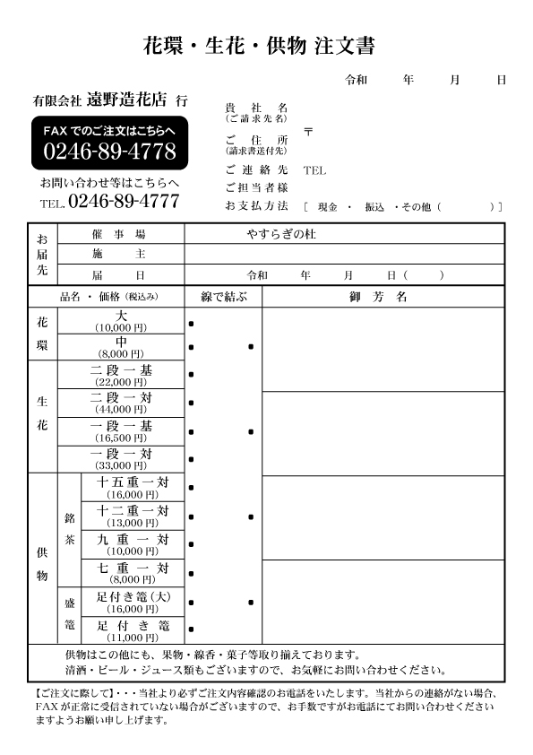 下のダウンロードページから「花環・生花・供物注文書」をダウンロードして、プリントしてください。