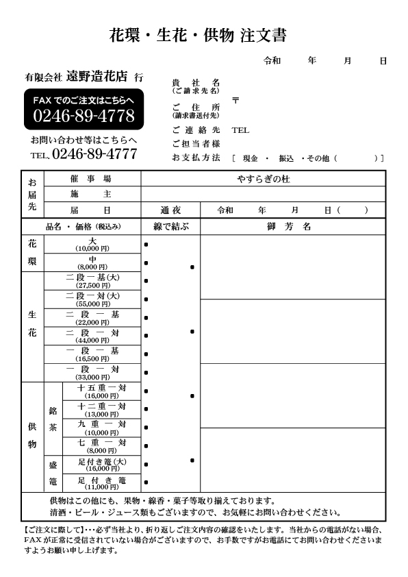 こちらの「花環・生花・供物注文書」をクリックするとPDFファイルをダウンロード・プリントができます。